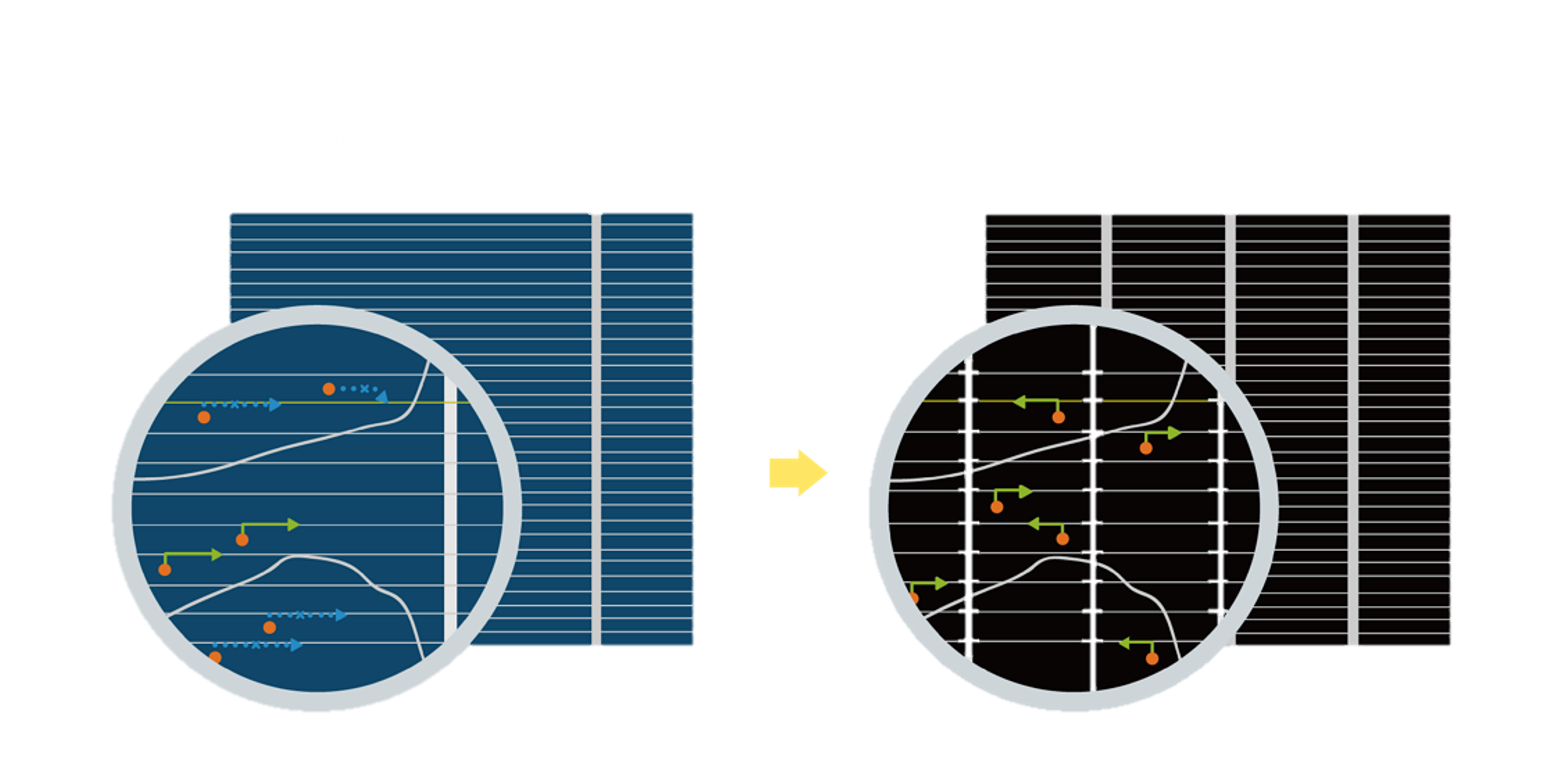 • 電池使用多條銅導線 (Copper wire) 於電池片上形成較短的電流路徑,提高電流收集效率,採用圓形設計的銅導線較傳統扁平式的銅焊帶 (Ribbon),可增加入射至電池的光線量。